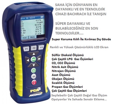 Bacharach PCA®3 cihazı çalıştırma işletim şartları, yanma verimini belirleme ve emisyon testlerinin uygulanması sonuçlarından emin olmak isteyen servis sağlayan teknisyen ve üstleniciler için mükemmel bir cihazdır. Bu hafif yapılı ve üst teknolojik sınıfındaki ürün ile hem baca gazları yanma etkinlikleri hemde emisyon gazları olan Baca gaz Oksijeni (O2), karbon Monoksid (CO), Sıcaklık Kümelerini, Kaymaları, Fark Basıncını, , Yanma Hava Sıcıklığı, opsiyon olarak Nitrik Oksid (NO), Nitrojen Dioksid (NO2) ve Sülfür Dioksid (SO2) ölçmek ve renkli grafik ekrandan izlemek mümkündür. PCA®3 aynı zamanda Yanma Verimini (EFF), Fazla Hava(EA), Karbon Dioksid (CO2), NOx ve Oksijen referans referans değerini hesaplayarak ekranlar.