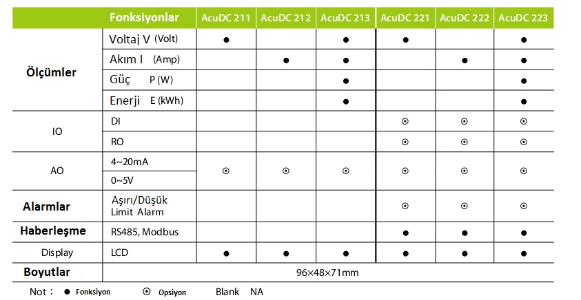 Monofaz DC Ölçüm cihazı, DC Enerji Analizörü, DC Güç, Voltaj, Akım Dönüştürücü ölçülen Her Parçadan Değer Seçip dönüştürme transdüseri 14bitlik bir çözünürlükle ARM tabanlı chip, 4-20mA yada 1-5V DC akım dönüştürme transdüseri, DC voltaj, akım dönüştürme transdüseri, güç dönüştürücü transdüseri, enerji dönüştürücü transdüseri olarak kullanılabileceği gibi opsiyon olarakta röle çıkış, alarm veya uzak nokta anahtarlamadada kullanılabilir, dijital girişlerle şalter izlemeyi bir arada bulunduran DC enerji analizörü, tüm ölçülen sinyal bileşenlerine RS-485 layeri üzerinden, MODBUS-RTU protokol ile ölçüm paramterelrine ulaşılarak DCS, PLC yada SCADA ya bu parametreler aktarılabilir. DC enerji analizörü olarkta anılan AcuDc 200 aynı zamanda 4DI, 2RO veya 1 adet Analog sinyal dönüştürücü olarakta üretilmektedir.